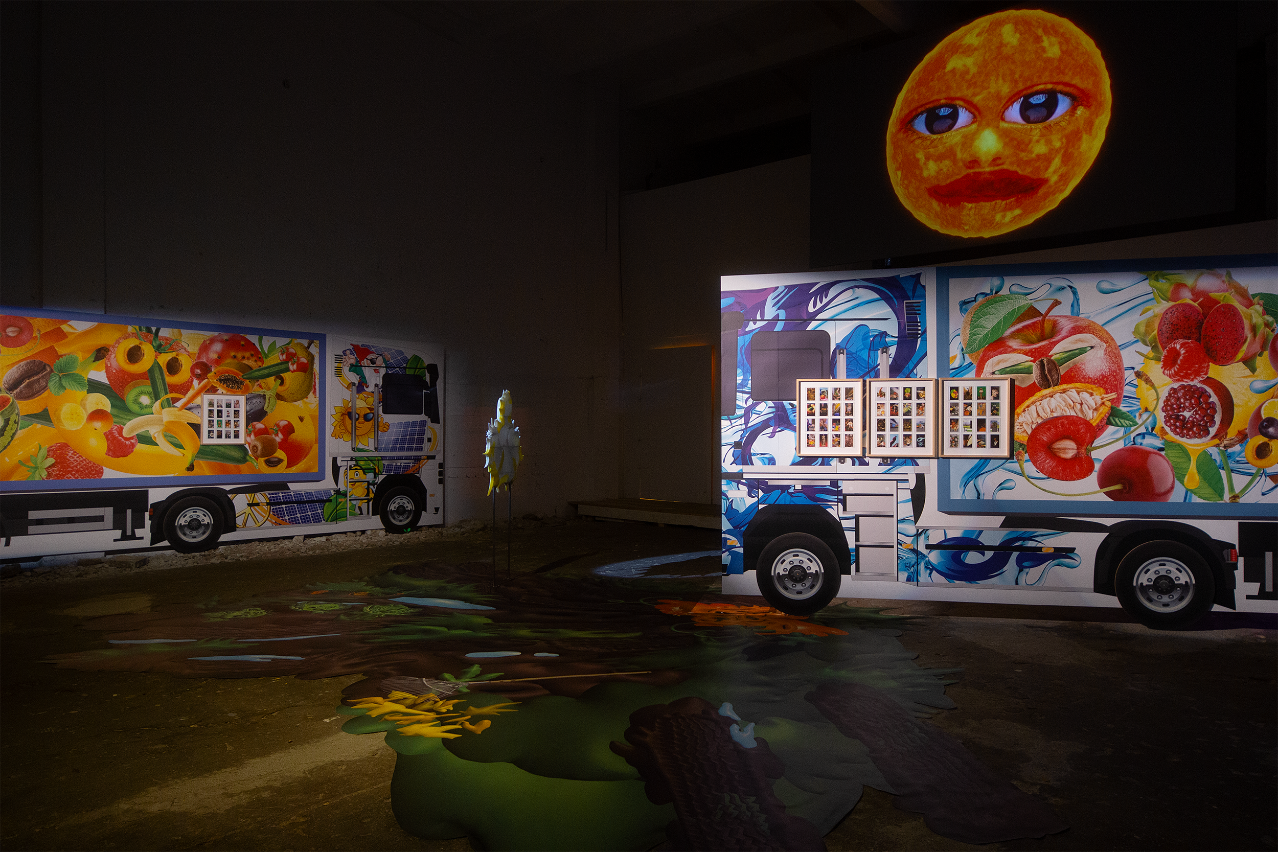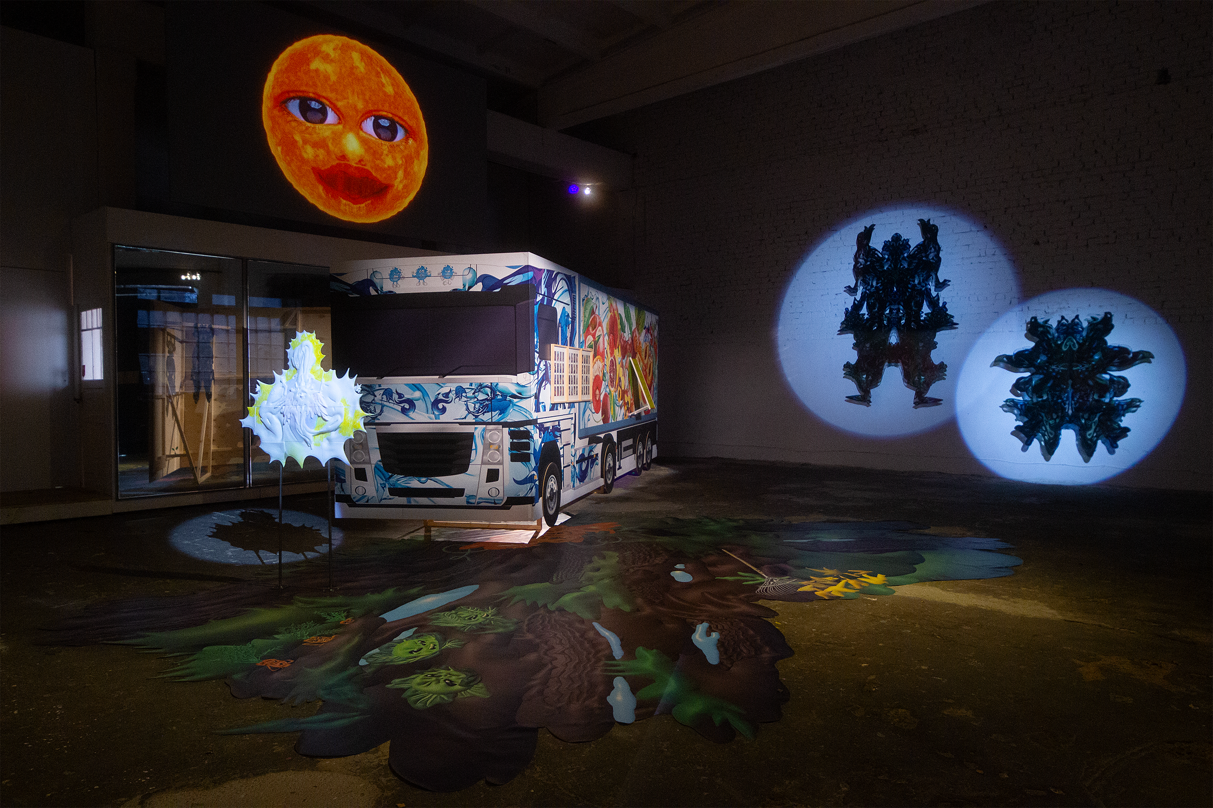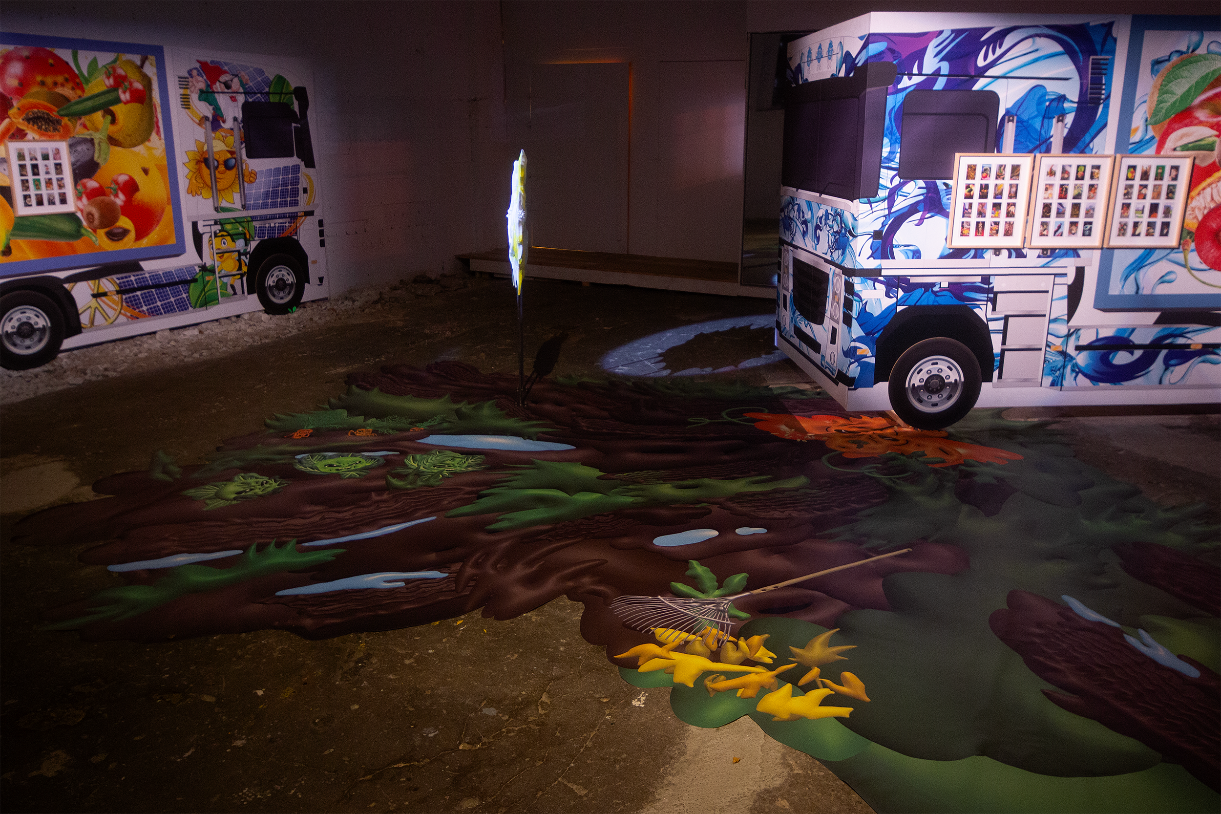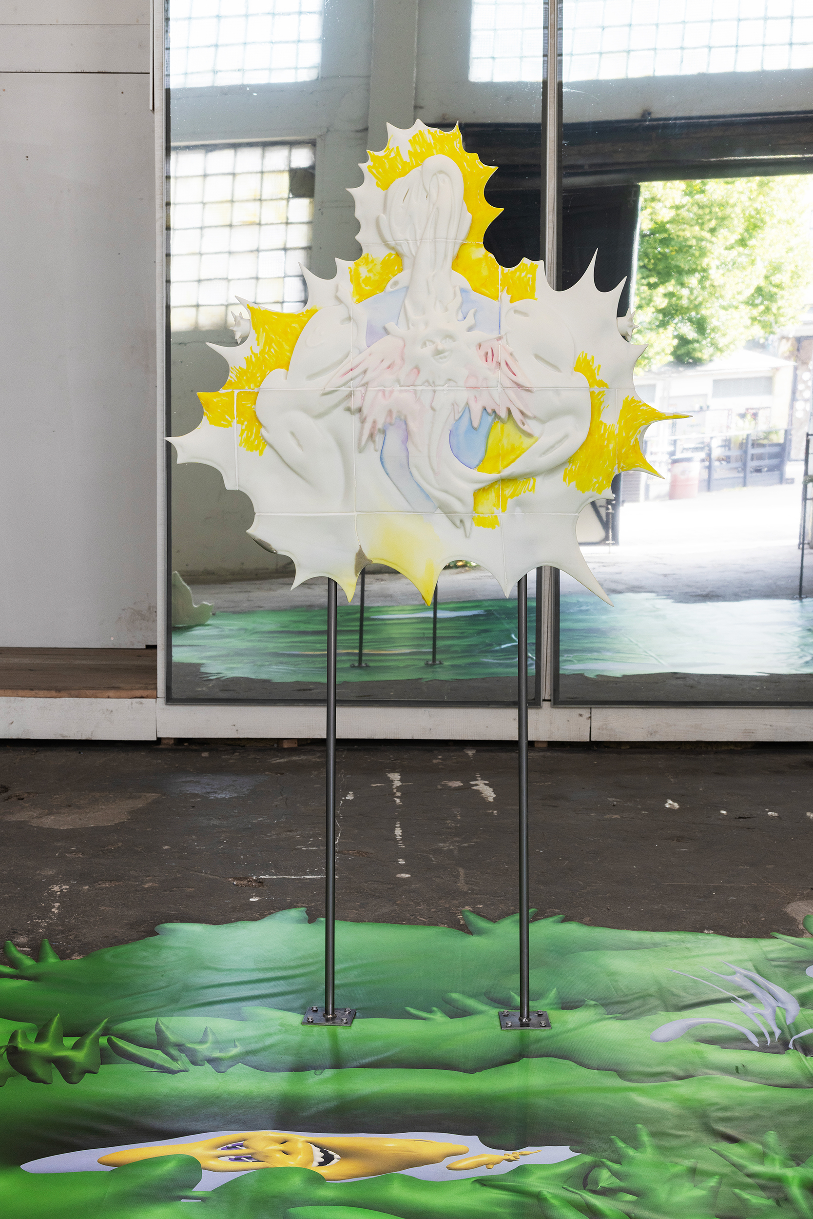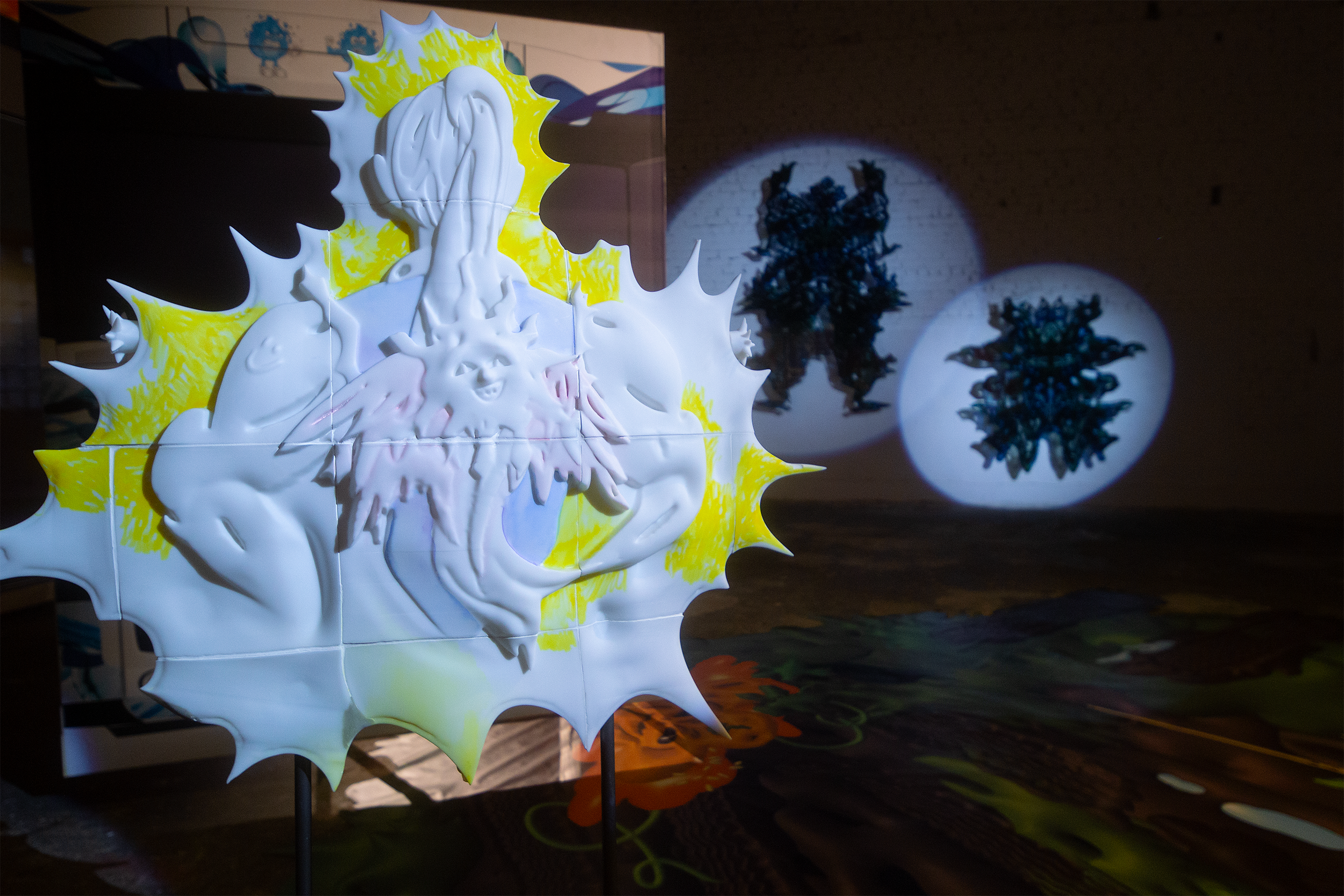 Mixed media installation / 3D printed resin, watercolor, alcohol ink marker, steel, digital print, mirror film