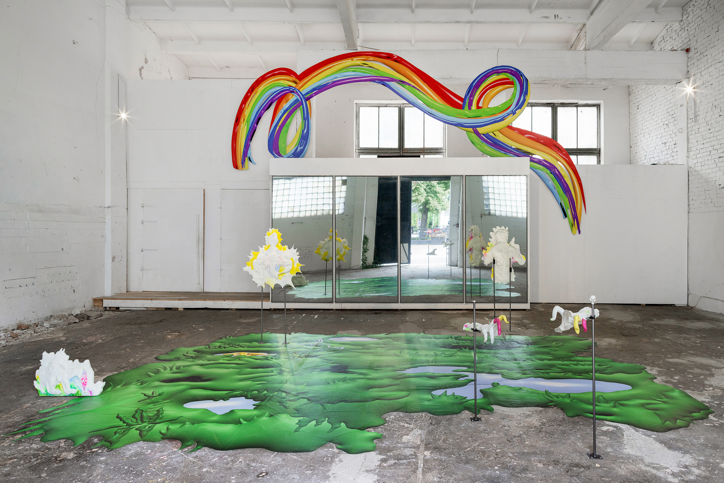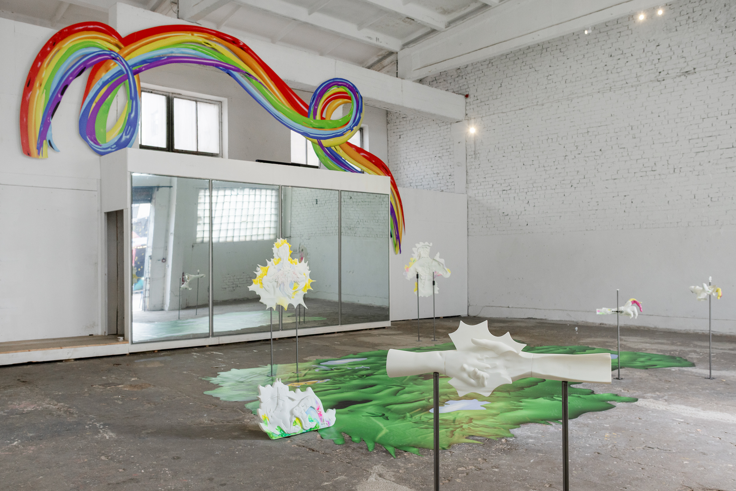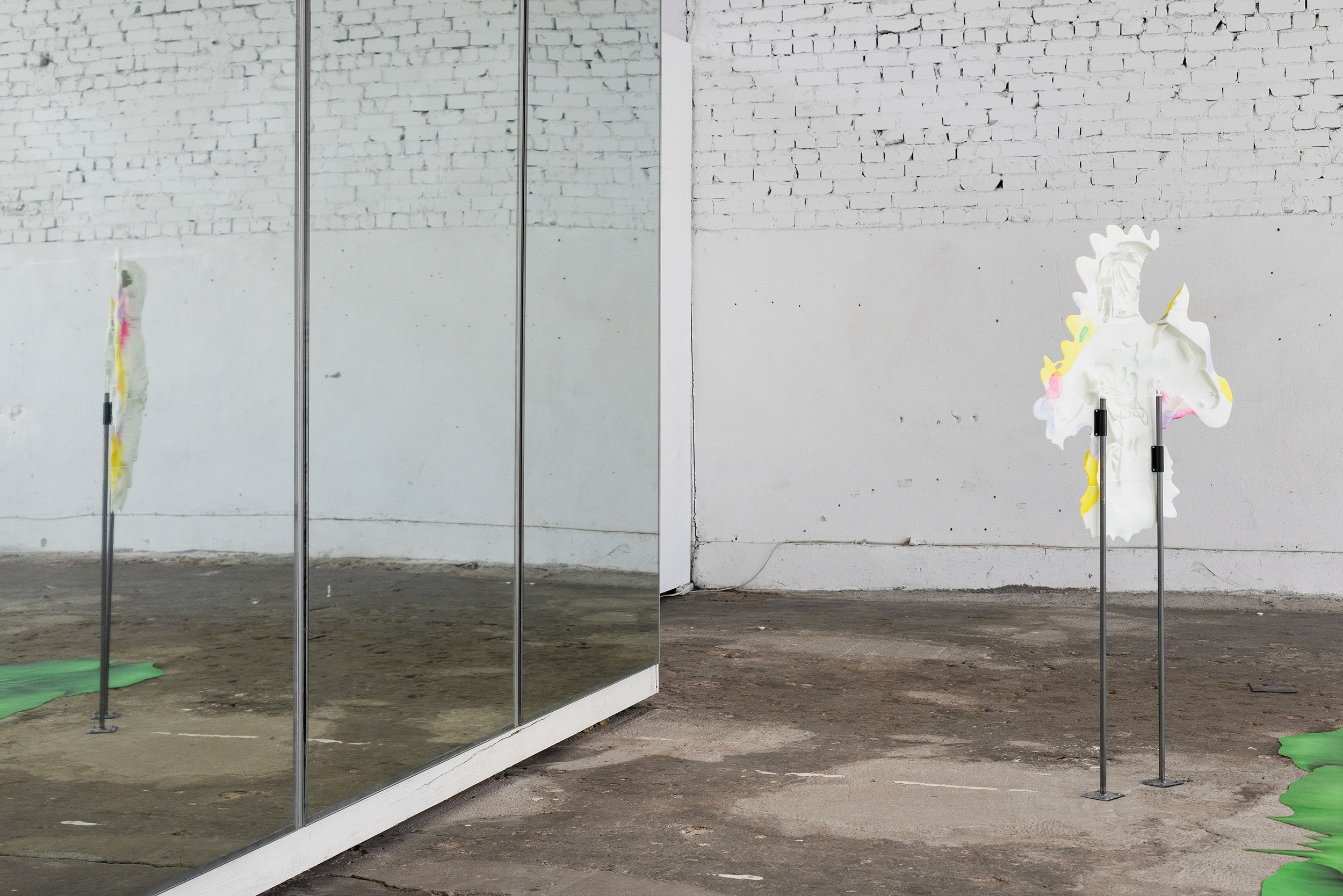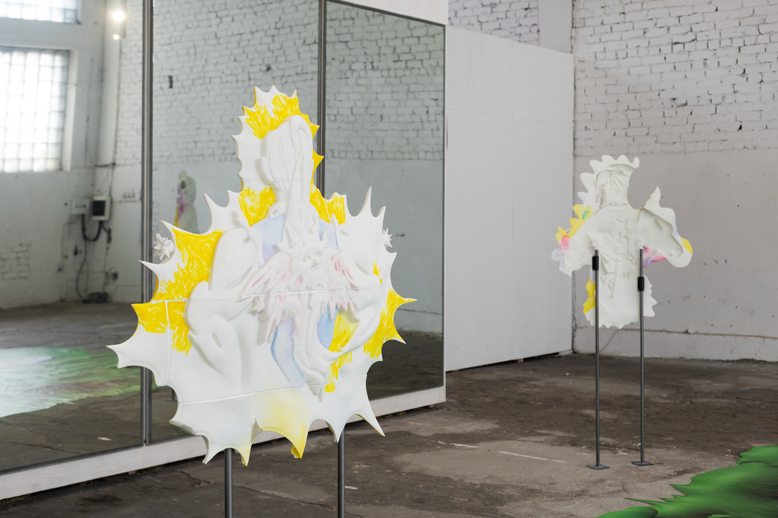Installation view of Field of Exercises. Dimensions variable. 3D printed resin, watercolor, alcohol ink marker, steel, digital print, mirror film. TUR, Riga, Latvia, 2025