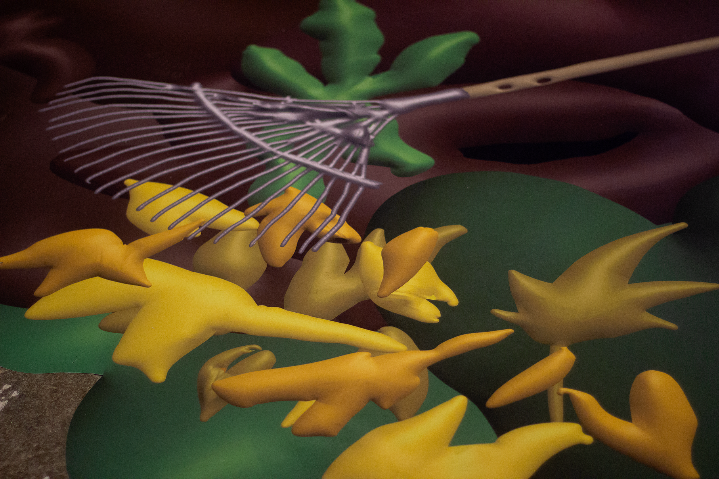 Hands to Tickle. Detail view. 3D printed resin, watercolor, alcohol ink marker, steel, digital print. TUR, Riga, Latvia, 2025