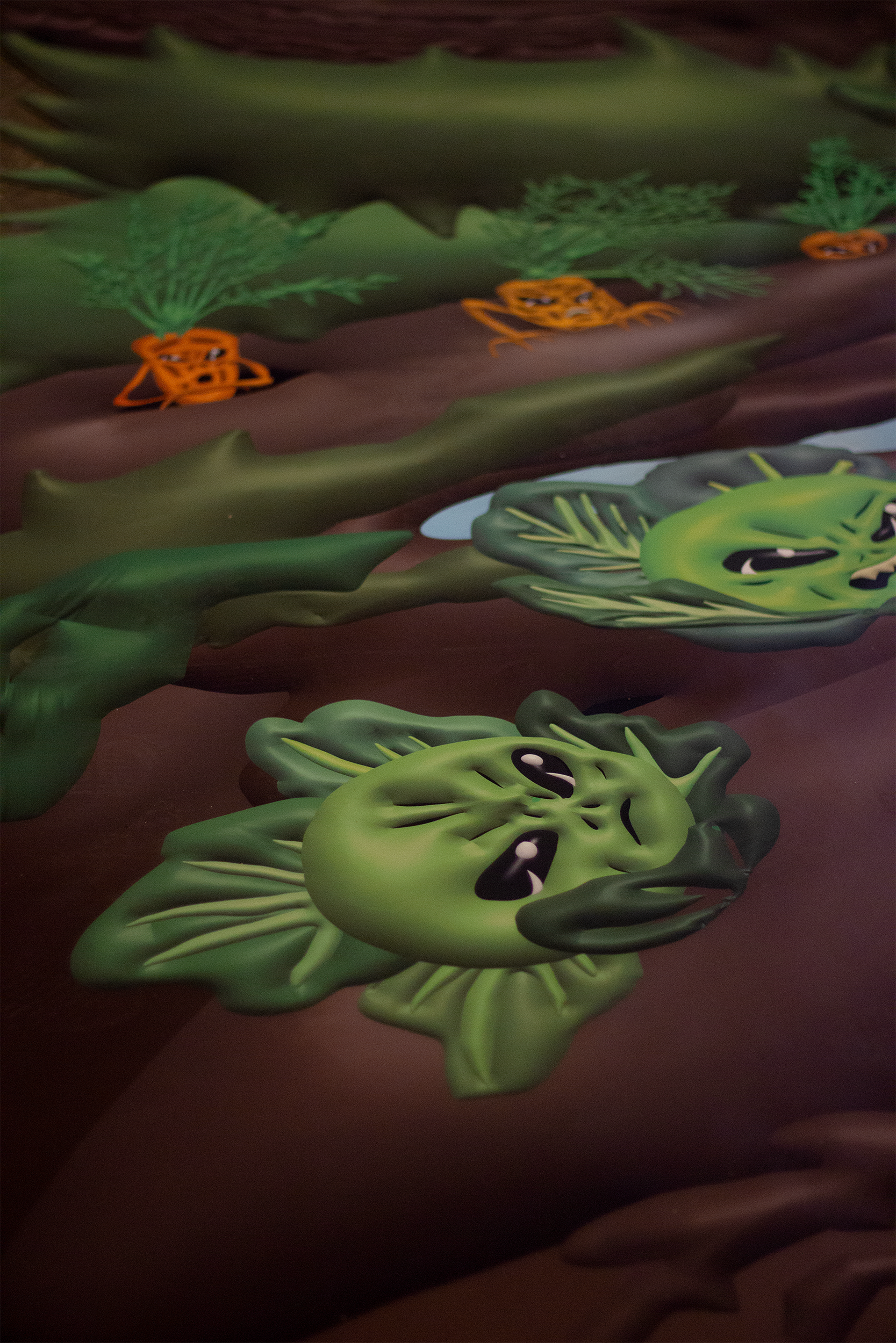 Hands to Tickle. Installation view. 3D printed resin, watercolor, alcohol ink marker, steel, digital print. TUR, Riga, Latvia, 2025